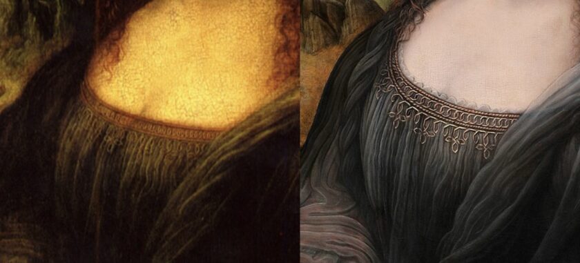 左がダ・ヴィンチの描いた『モナ・リザ』。右が弟子の描いた『モナ・リザ』の模写です。右の方がはっきりと模様がわかりますが、ダ・ヴィンチは無限の連続性を持つ美しい結び目を好んでいました。