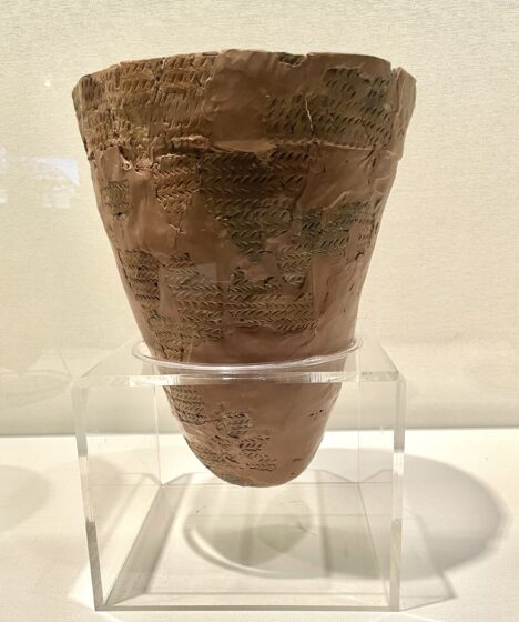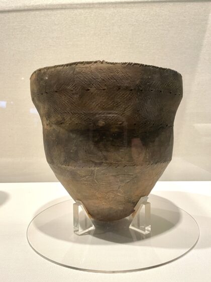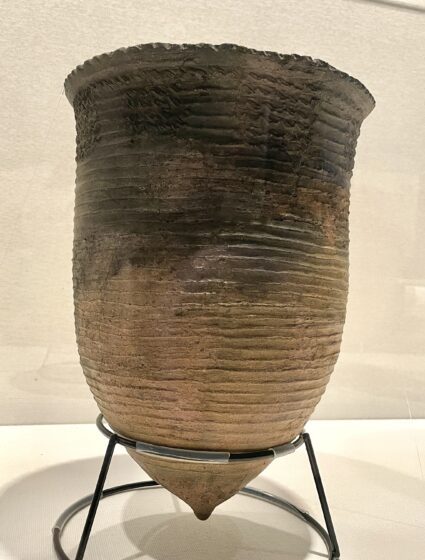 こちらの土器をご覧ください。その形から「円筒土器」と呼ばれています。底が平たいのが特徴的で、保管しやすい実用的な土器になっています。