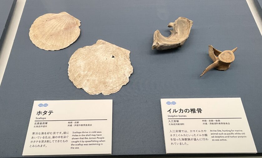 私たちも食べているホタテ、その右隣はイルカの骨です。縄文人はイルカやクジラも食べていたようです。