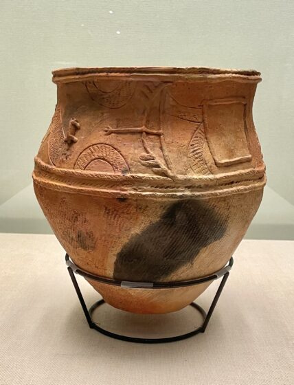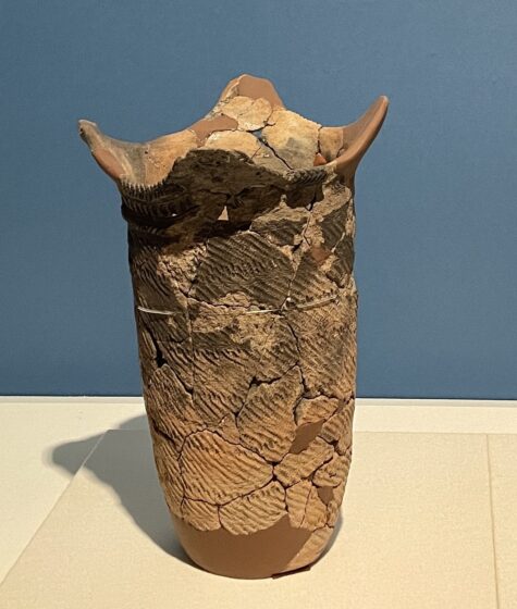 そして、こちらが「縄文」という言葉が生まれるきっかけとなった、“ザ・縄文土器”です。器の上部を見てみると、2種類の縄目を用いて装飾されていることがわかります。