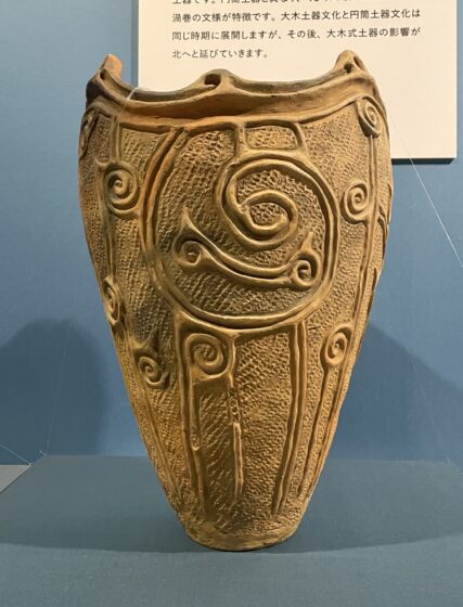 「大木土器」と呼ばれる装飾的な土器があります。円筒土器が北エリアで展開したのに対し、「大木土器」は南エリアで広がっていました。大木土器の“大木”とは、宮城県の松島湾沿岸にある大木囲貝塚から発掘された土器に由来して命名されています。土器の形状には膨らみがあり、渦巻の文様が特徴的です。