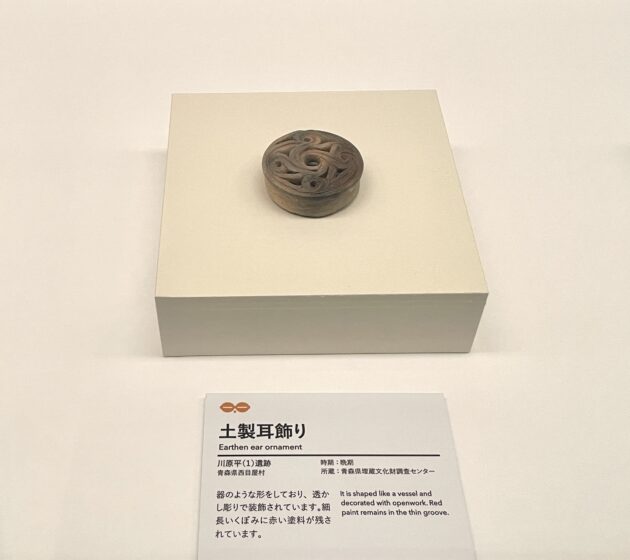 こちらの土偶は、岩手県盛岡市でバラバラの状態で見つかったものを復元したものです。顔がやや右に傾くように作られているのがポイントです。