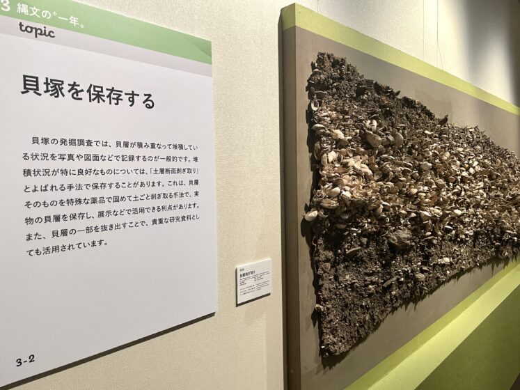 貝塚があるように、縄文人は貝を食べていました。リアル貝塚の展示もありましたが、なかなかの迫力がありました。特殊な薬品を使用することで、土の断面ごと保存しておくことができるそうです。