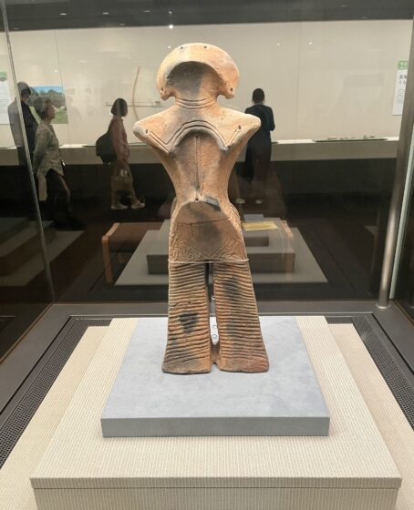こちらも国宝の土偶で、複製のものです。「中空土偶」と言われ、中が空洞になっているのが特徴的です。残念ながら頭部と両腕が欠けています。顎は黒く、胴体は赤く塗られた痕跡があります。