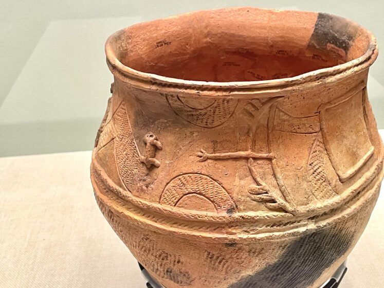 時代が進むにつれ、装飾もバリエーションが豊かになってきます。こちらは「狩猟文土器」と呼ばれ、弓矢を動物に放つ様子が表現されています。青森県で発見されています。