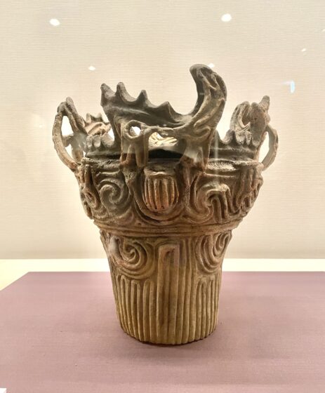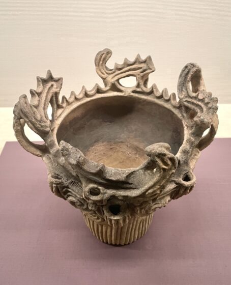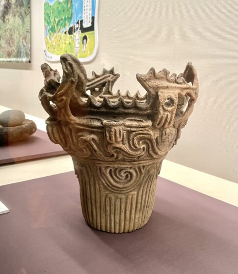 芸術家の岡本太郎も驚いたという、縄文土器で最もインパクトがある土器は、「火焔型土器」と呼ばれていて、新潟県内で出土しています。今回の展示では、山形県の遊佐町で発見された同じタイプの土器がありました。内面には煮炊きによる炭水化物の痕跡が残されています。とってもアートな見た目なので、上部からと側面からの写真も掲載します。